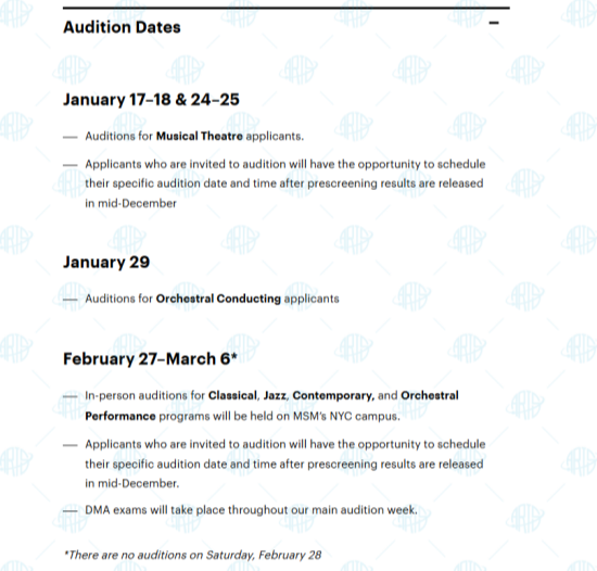 曼哈顿音乐学院 2026 各专业试镜时间速查