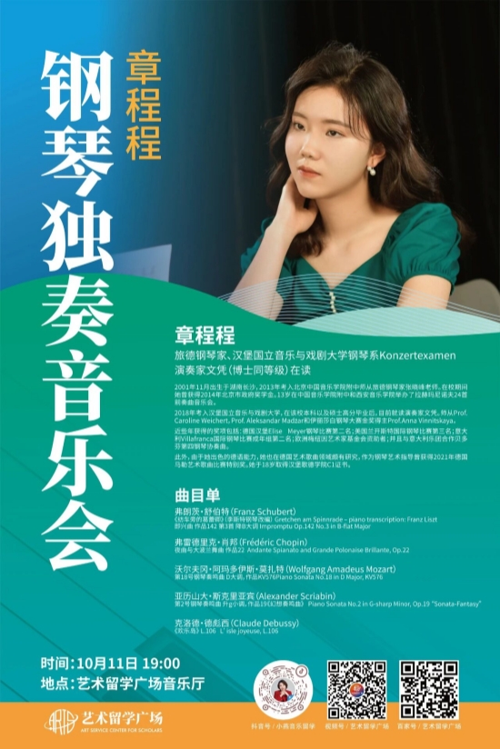 金秋十月,艺术留学广场迎来重磅音乐盛宴 —— 曾从这里走出的优秀学员、旅德钢琴家章程程将 “回娘家”,于 10 月 11 日 19:00 在艺术留学广场音乐厅,为中国琴童带来一场高水准的钢琴独奏音乐会,用精湛琴技传递古典音乐的魅力。