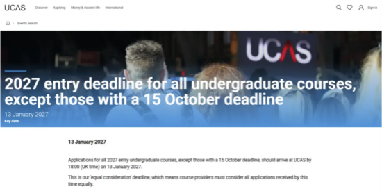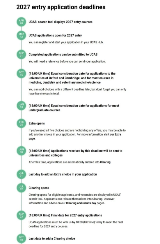与此同时,关注2027年入学的同学注意啦!UCAS(英国大学和学院招生服务中心)官方已正式公布2027 Fall完整申请时间线,划重点——和往年相比,多个核心截止日期均提前1天,整体申请节奏全线前移!
