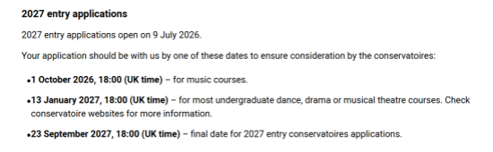• 2027年1月13日,18:00(英国时间)—— 大多数本科舞蹈、戏剧或音乐剧课程申请截止,更多详情可查看目标音乐学院官网。