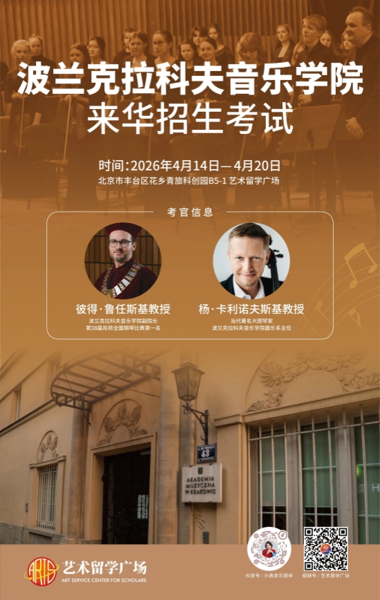 发布时间:2026-03-20 09:59 来源:艺术留学广场 关键词:克拉科夫音乐学院,波兰音乐学院,音乐生留学,留学申请波兰国立顶尖音乐学府——克拉科夫音乐学院2026年度中国区专场招生正式启动。本次招生由校方官方主办,定于4月19日在北京举办线下直招考试,为广大音乐学子提供本科、硕士一站式录取通道,无需跨境赴考,无需远程线上考核,在家门口即可直通欧洲顶级音乐院校。