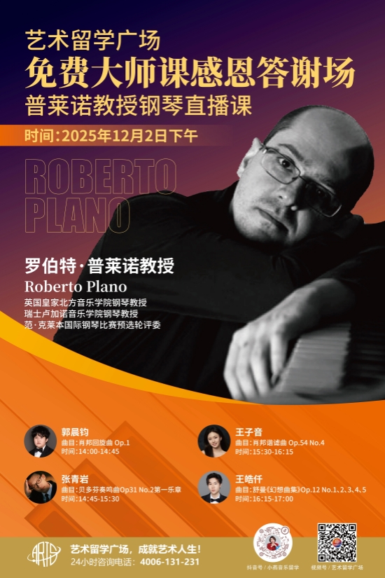 发布时间:2025-12-02 09:43 来源:艺术留学广场 关键词:艺术留学广场,艺术留学,英国北方皇家音乐学院,公开大师课秋冬渐浓,音乐暖意如期而至!国际钢琴大师罗伯特・普莱诺(Roberto Plano)教授携超高口碑再度返场,12 月 2 日下午,将做客艺术留学广场带来公开大师课,全网直播邀你共赴这场音乐盛宴~