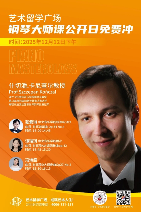 发布时间:2025-12-10 15:18 来源:艺术留学广场 关键词:艺术留学广场,艺术留学,波兰音乐学院,钢琴公开课,音乐生想近距离接触国际钢琴教授?想深入了解波兰音乐教育精髓?12月12日下午,艺术留学广场钢琴大师课公开日重磅开启!