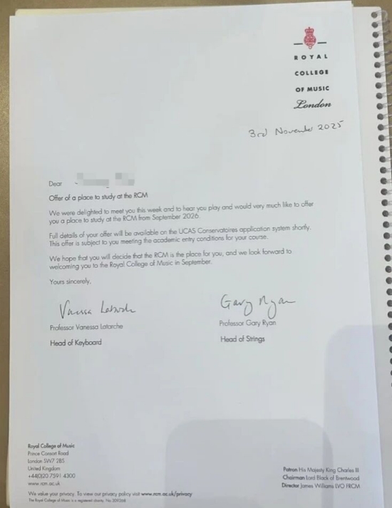 发布时间:2025-11-05 15:41 来源:艺术留学广场 关键词:英国皇家音乐学院,艺术留学广场,艺术留学,英国留学昨天必须吹爆一个好消息!艺术留学广场的两位同学——一名小提琴专业、一名钢琴专业,昨天参加英国皇家音乐学院(RCM)现场考试,当场发放offer,还直接被承诺给奖学金!这波操作简直满分!