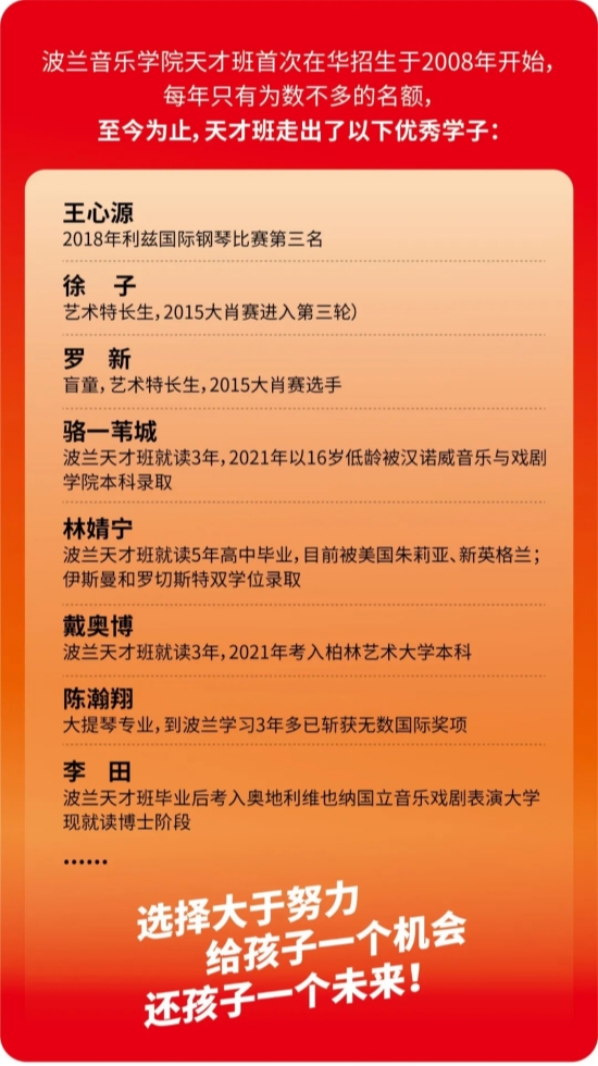 注:波兰 “天才班” 是欧洲教育体系中大学前的精英教育项目,专为小年龄音乐天才打造,既能让孩子接受正宗欧洲音乐熏陶,又能避免国内过度竞争,是 10-17 岁音乐娃的最优求学选择~