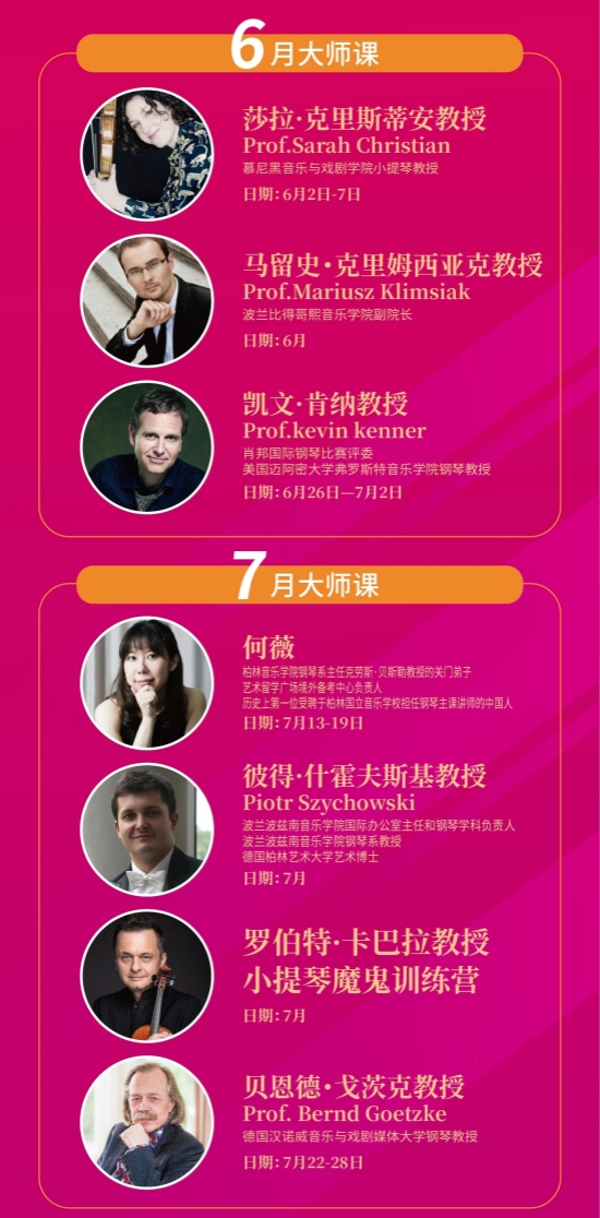 2026年,我们将邀请30位国际知名教授亲临中国授课,线下课程涵盖钢琴、小提琴两大核心品类,让你不出国门,就能沉浸式感受顶级教学的魅力。