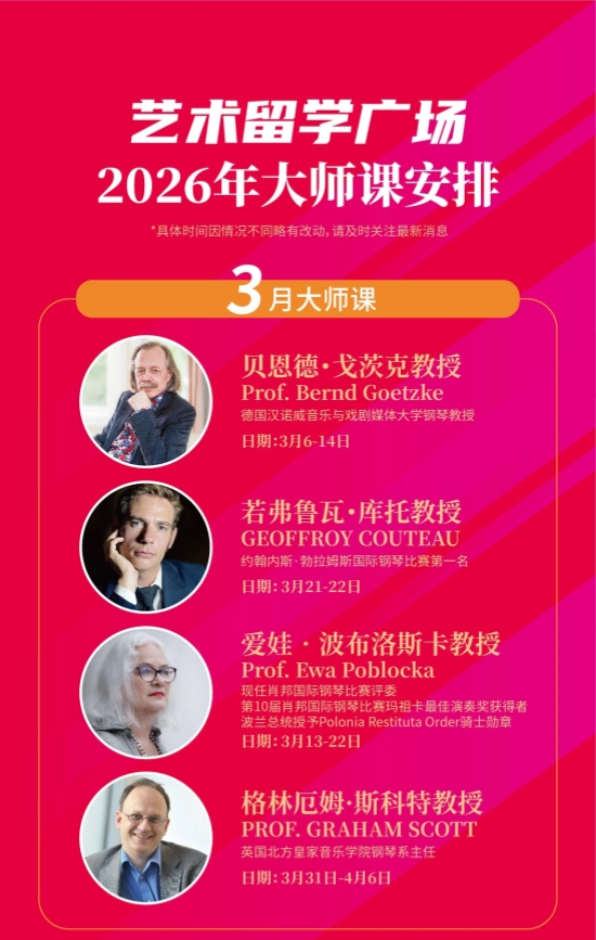 发布时间:2026-03-10 10:35 来源:艺术留学广场 关键词:艺术留学,艺术留学广场,钢琴大师课,钢琴生,美国音乐学院,英国音乐学院,德国音乐学院,波兰音乐学院,小提琴三八节,囤点大师课✨给成长留一份底气,给热爱留一个出口